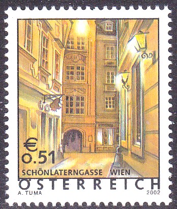 Dieses Postwertzeichen zu 0,51 €, Österreich MiNr. 2363, zeigt die Schönlaterngasse, eine berühmte, kleine, verwinkelte Gasse in der Wiener Innenstadt: