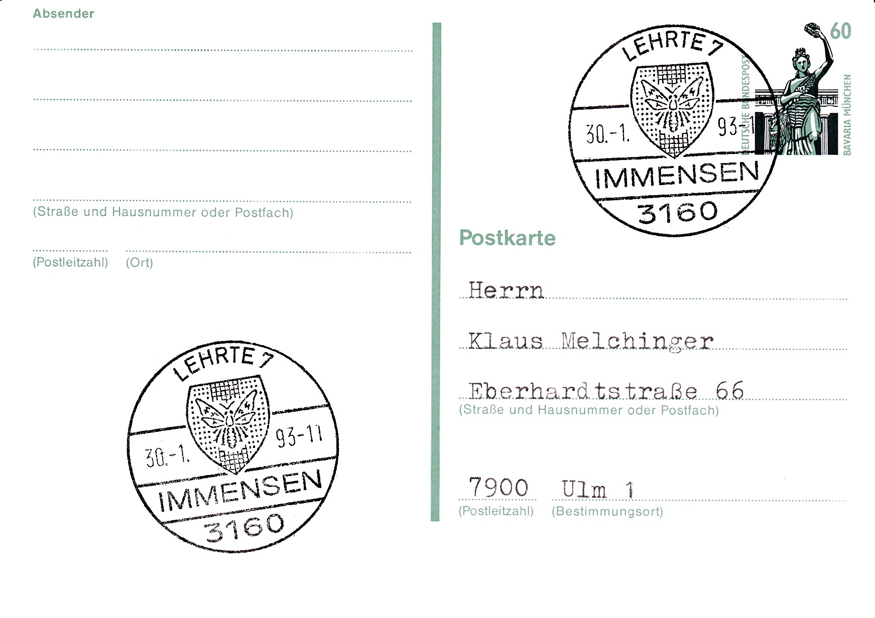 Auf diesem bereits von Heinz hier im Forum gezeigten Beleg wurde ein Poststempel abgeschlagen, der eine Imme zeigt: