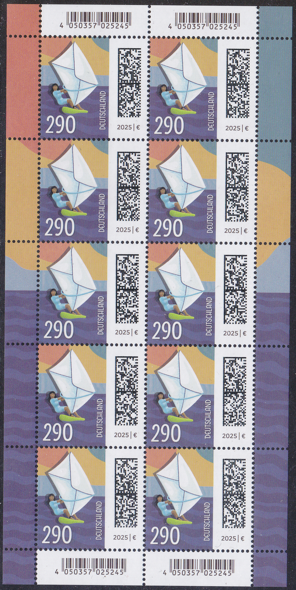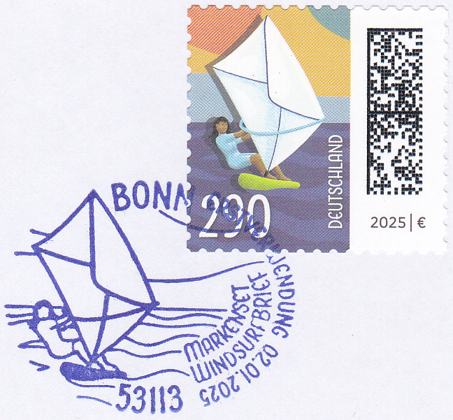 Am 2. Januar 2025 ist eine nassklebende Marke zu 290 Cent mit dem Motiv "Surferin auf Brett mit Briefsegel" erschienen.