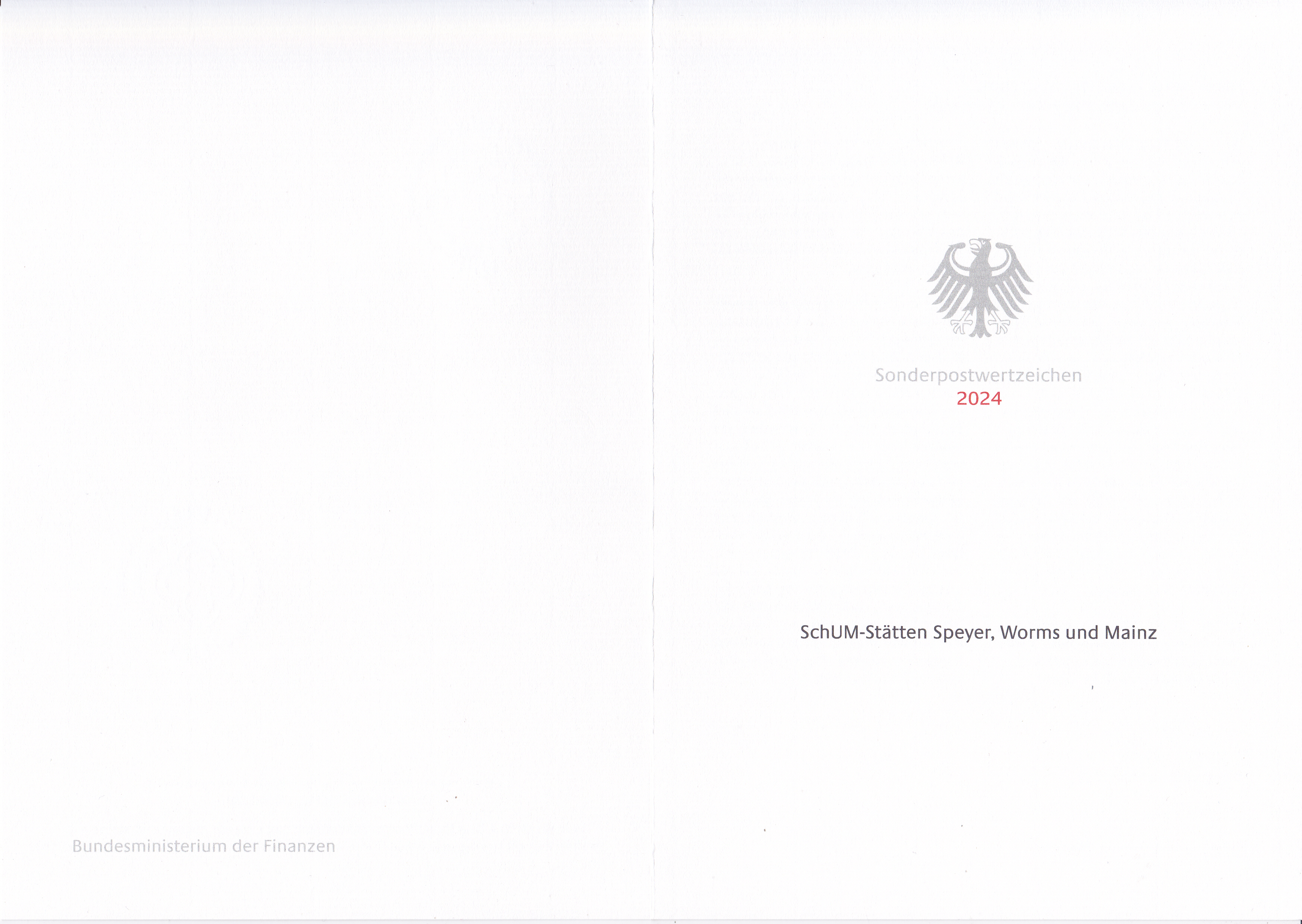 Ministerkarte des Bundesministers für Finanzen mit zwei Marken "Jüdisches Erbe in Speyer, Worms und Mainz'" (MiNr 3872) mit dem Motiv "Davidstern, Menora, Synagoge und Thora mit Akronym "SchUM", gebildet aus den hebräischen Anfangsbuchstaben der Städte Speyer, Worms und Mainz" und den beiden Ersttagsonderstempel Bonn und Berlin.