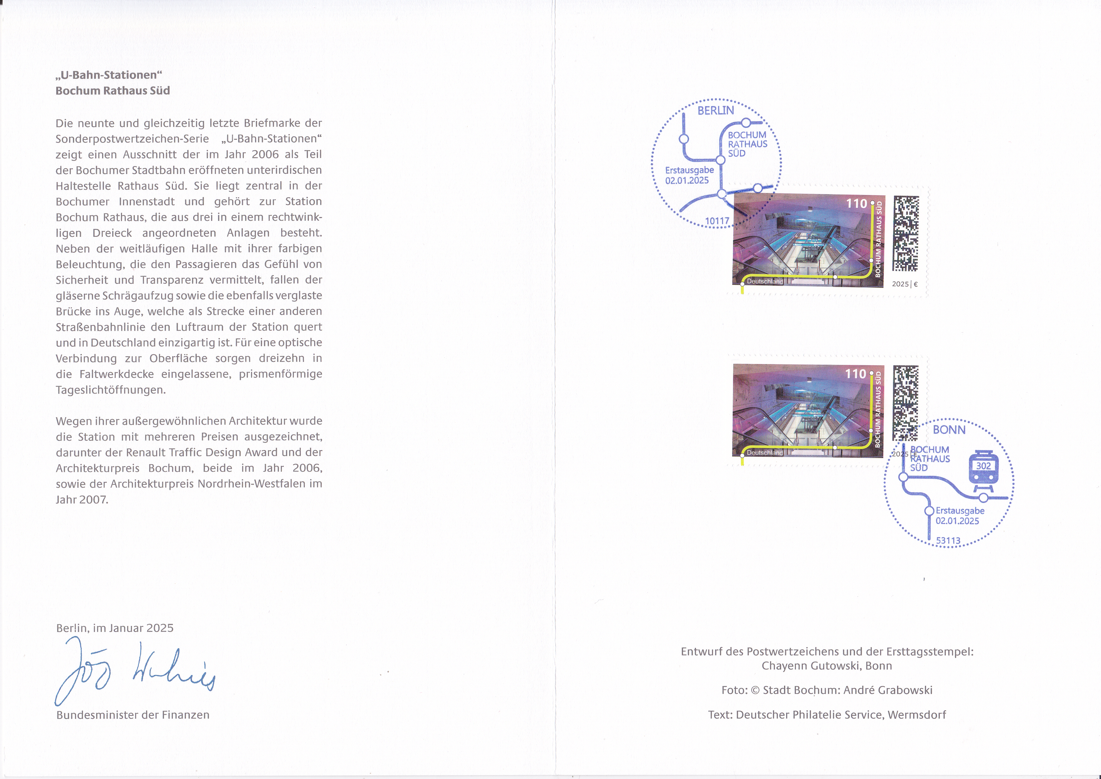 Ministerkarte des Bundesministers für Finanzen mit zwei Marken (MiNr 3878) mit dem Motiv "U-Bahn-Haltestelle Rathaus Süd, in Bochum" aus der Serie "U-Bahn-Stationen" und den beiden Ersttagsonderstempel Bonn und Berlin.