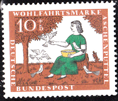 Auf dieser Marke (MiNr 485) aus der Wohlfahrtsmarkenserie 1965 lässt sich Aschenputtel von den Tauben beim Sortieren der Linsen helfen.