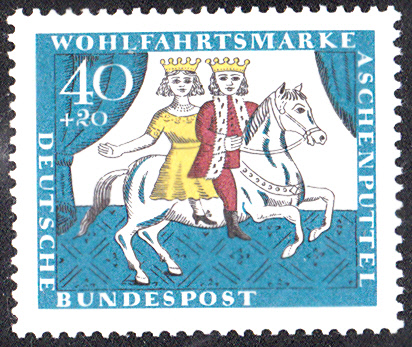 Diese Marke aus Österreich gehört zwar zu den "Marken auf Privatbestellung" wurde aber von der Post selbst in einem Buch mit dem Titel "Ausgewählte Märchen der Gebrüder Grimm" verkauft. Die Marke zeigt den verlorenen Schuh auf der Treppe des Schlosses.