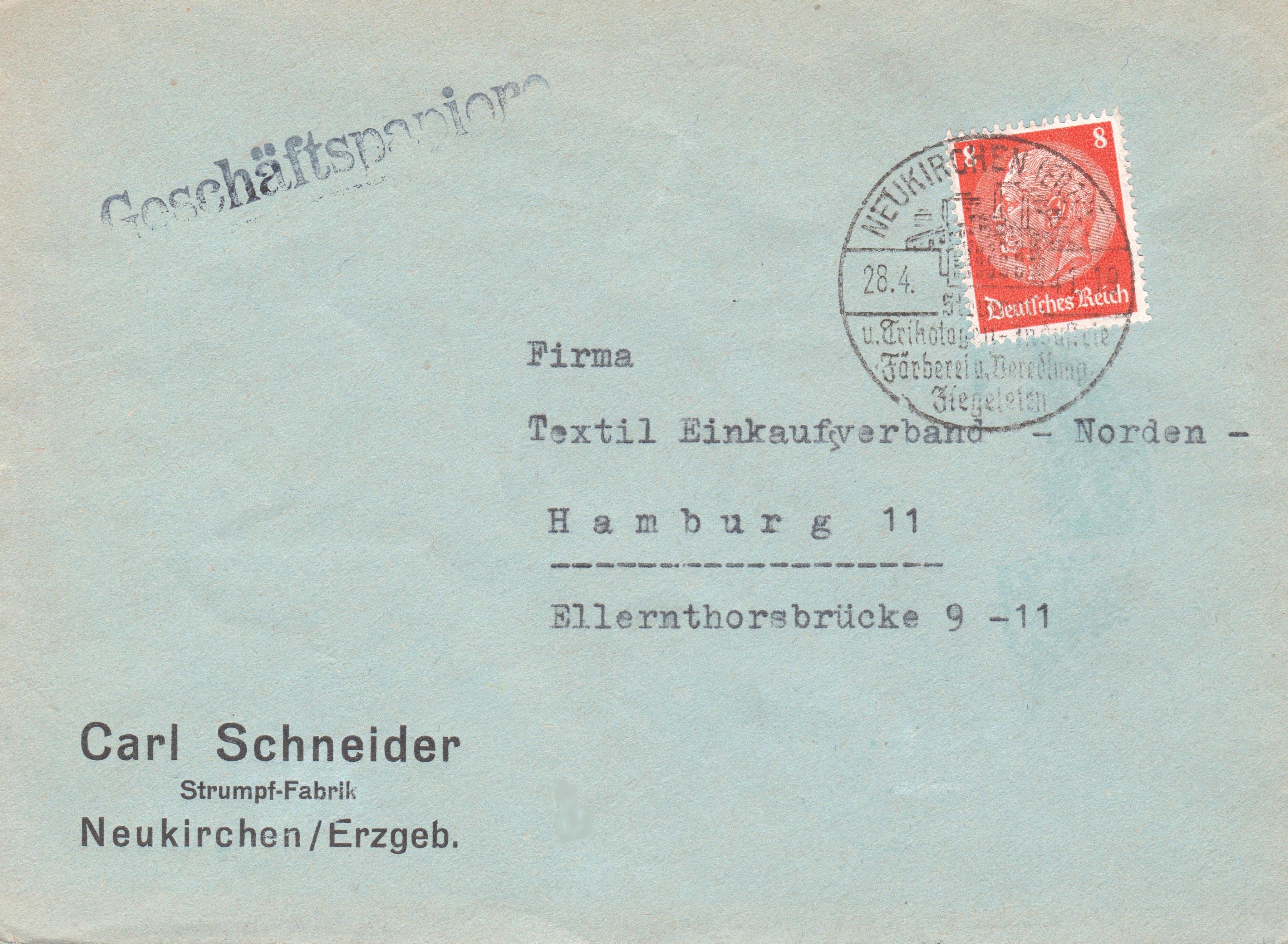 Sendungsart "Geschäftspapiere", Portostufe 8 Pf, freigemacht per Einzelfrankatur 8 Pf Dauerserie Hindenburg, entwertet am 28.04.1941 in NEUKIRCHEN (ERZGEB) mit Werbung für "Strumpf- und Tricotagen-Industrie":