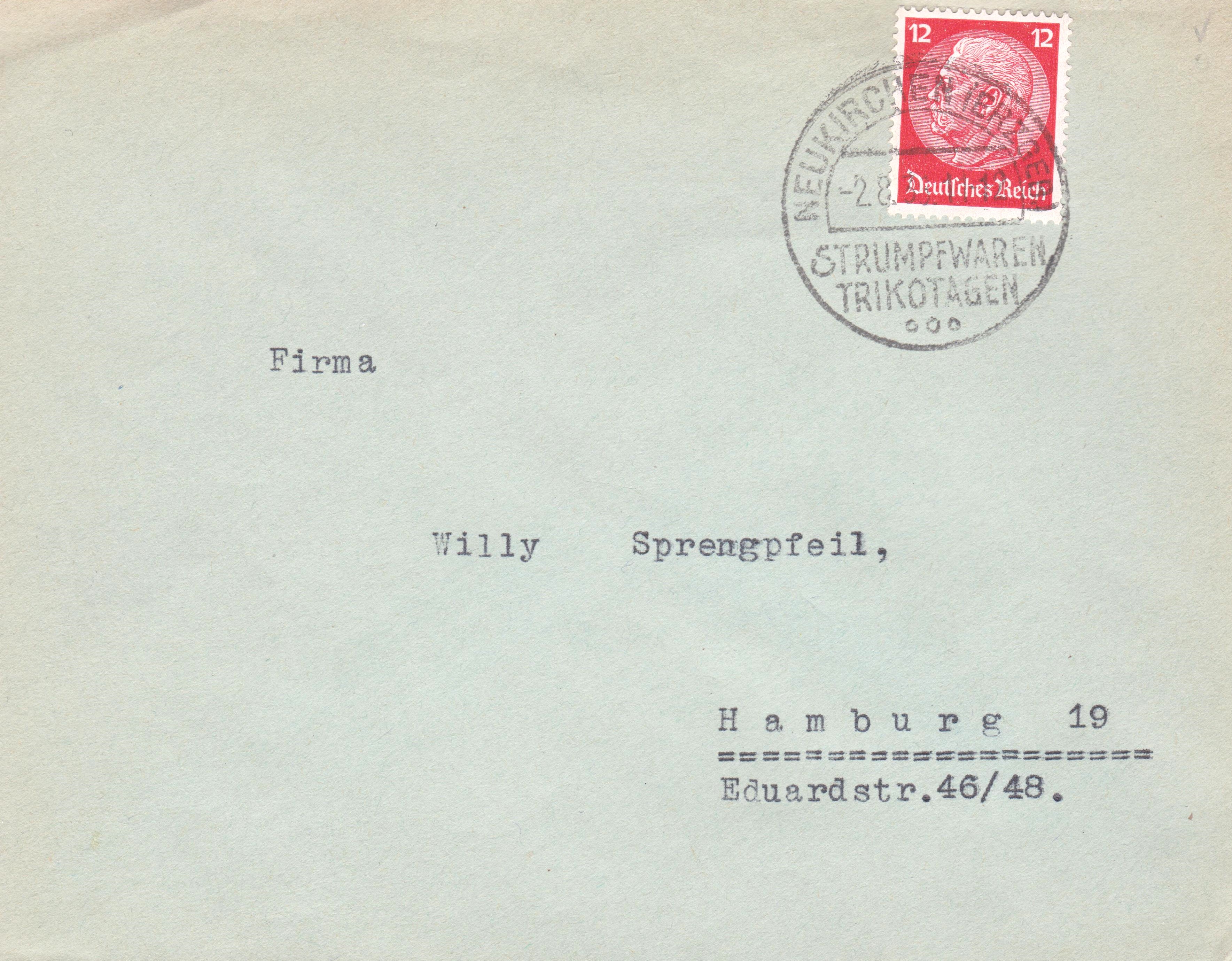 Sendungsart Brief im Fernverkehr, Portostufe 12 Pf, freigemacht per Einzelfrankatur 12 Pf Dauerserie Hindenburg, entwertet am 02.08.1933 in NEUKIRCHEN (ERZGEB.) mit Werbung für "STRUMPFWAREN TRICOTAGEN":