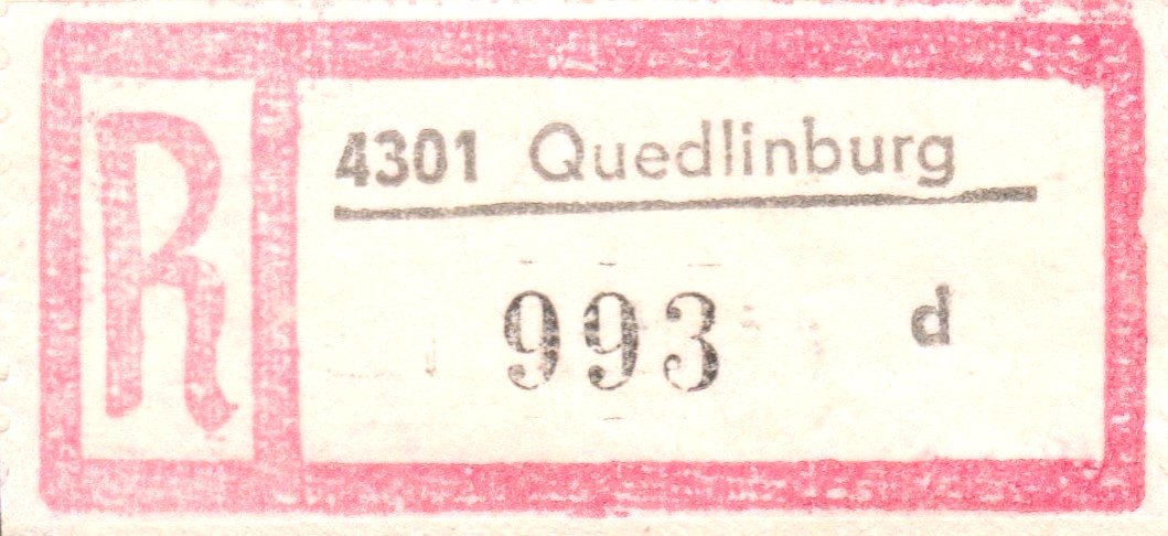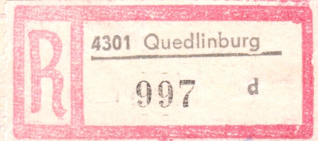 Einschreibzettel aus 4301 Quedlinburg, gedruckt auf Pergamin-Papier: