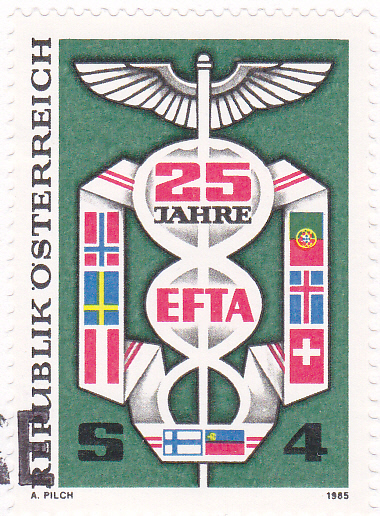 Zum Jubiläum "25 Jahre Europäische Freihandelszone (EFTA)" erschien in Österreich eine Marke (MiNr 1813) mit einem Merkurstab und den Flaggen der EFTA-Staaten.