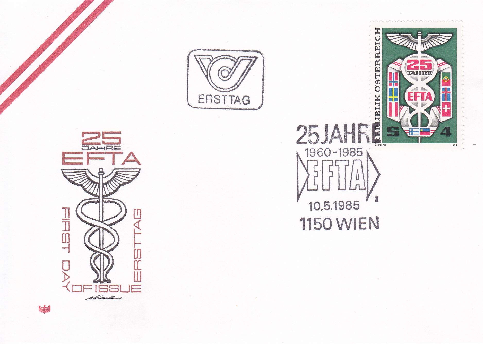Zum Jubiläum "25 Jahre Europäische Freihandelszone (EFTA)" erschien in Österreich eine Marke (MiNr 1813) mit einem Merkurstab und den Flaggen der EFTA-Staaten.