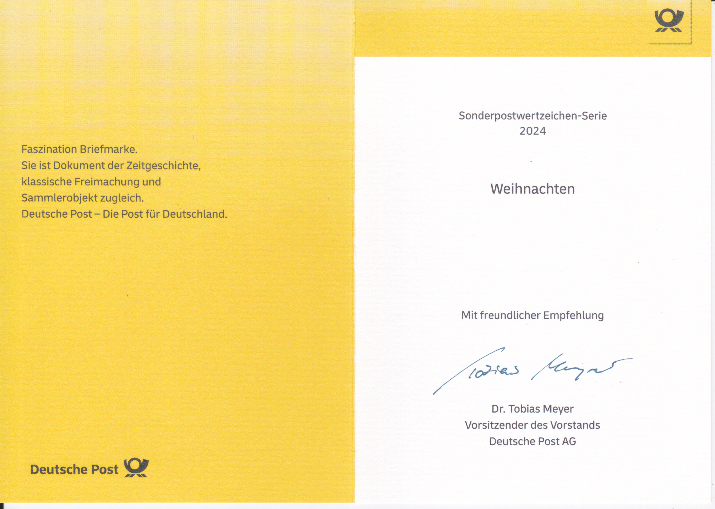 Klappkarte des Vorstandsvorsitzenden der Deutschen Post AG mit einer Weihnachtsmarken (MiNr 3862) mit dem Motiv "Himmlisches Licht" nach einem Detail eines Kirchenfensters der Abteikirche Tholey von Mahbuba Elham Maqsoodi und dem Ersttagsonderstempel Bonn.