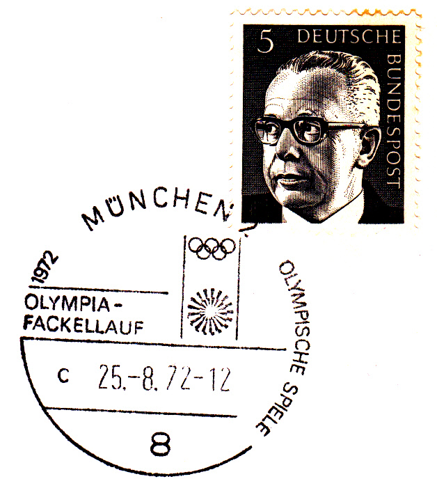 Am 25.8.1972 erreichte der Fackellauf den Olympiaort München, wie dieser Sonderstempel aus München vom 25.8.1972 Kennbuchstabe "a" ohne Uhrzeit beweist.
