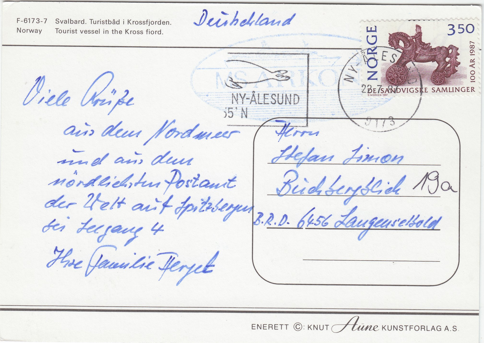 Zwei Tage später, am 22.07.1987, besuchte das Kreuzfahrtschiff MS ARKONA das norwegische Ny-Ålesund, http://tools.wmflabs.org/geohack/geohac ... e:city(120" target="_blank), wo sich laut Text das nördlichste Postamt der Welt befindet: