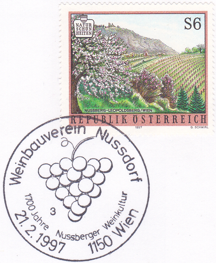 FDC mit schon hier gezeigten Marke aus der Serie "Naturschönheiten in Österreich" (MiNr. 2211) mit der Abbildung "Weingärten auf dem Nussberg vor dem Leopoldsberg bei Wien" und einem zur Marke passenden Sonderstempel mit der Kennziffer "3" aus Wien.