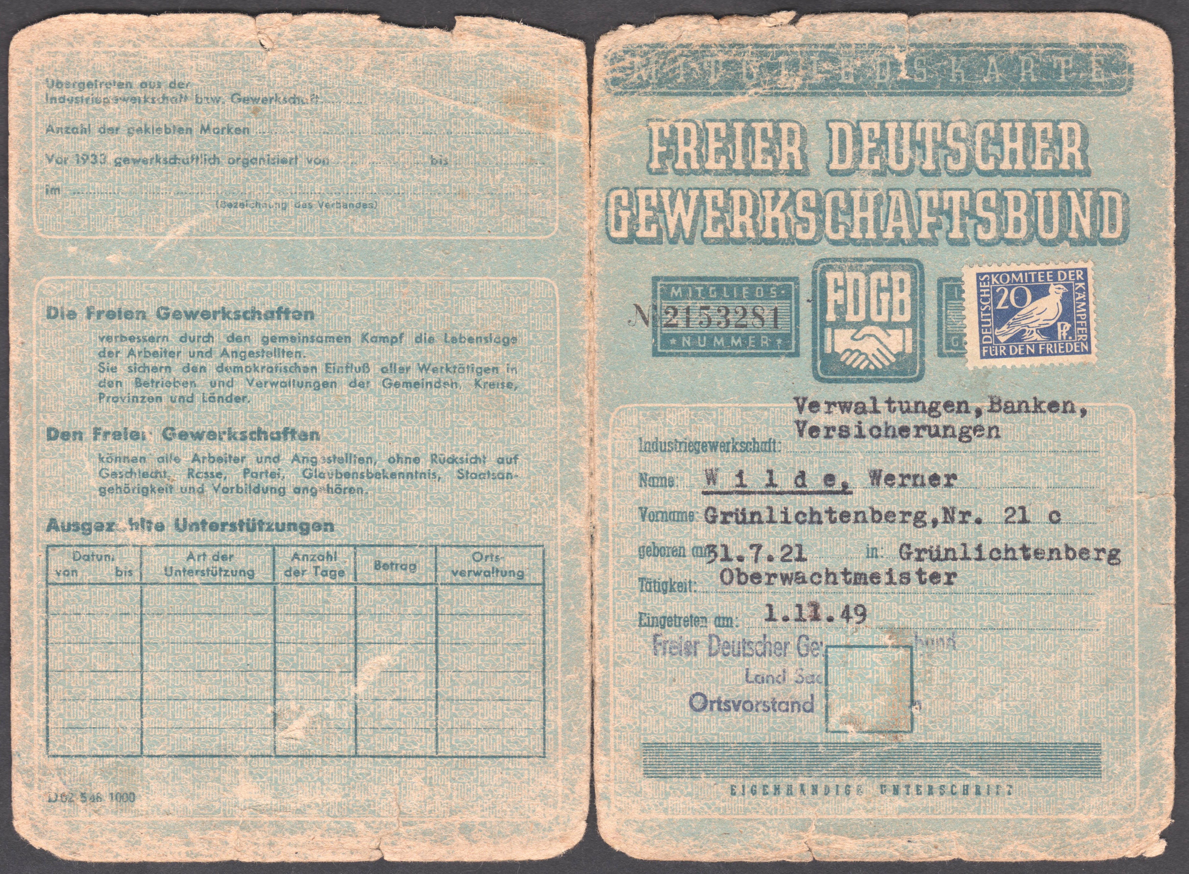 FDGB-MITGLIEDSKARTE, ausgestellt am 01.11.1949: