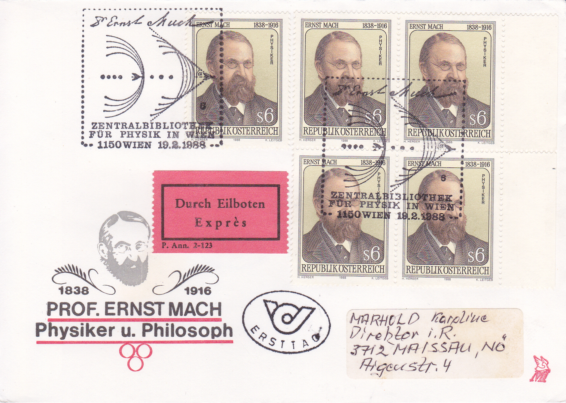 Diese Marke aus Österreich (MiNr 1988) zum 150. Geburtstag von Ernst Mach zeigt ein Porträt von Mach.