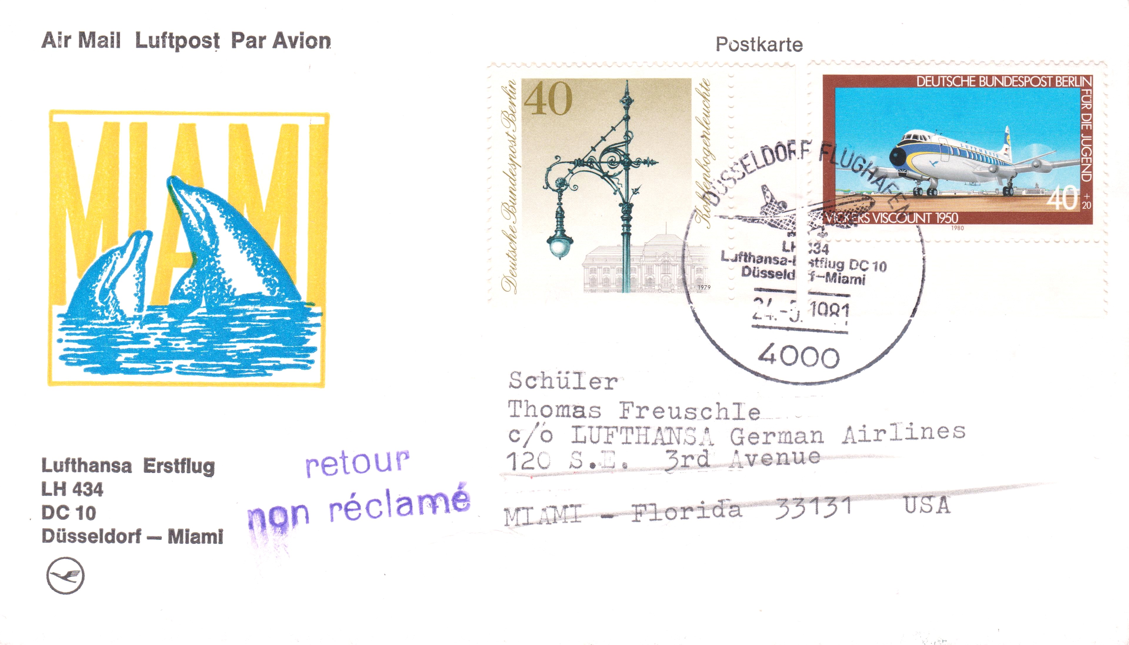 Eine Marke aus Paraguay (MiNr 2677) aus dem Block (MiNr Block 246) zeigt unter anderem links unten eine Douglas DC-10 der Deutschen Lufthansa. Bei dem gezeigten Block handelt es sich um einen "Muster"-Block.