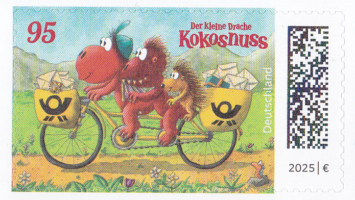 Bei der Deutschen Post ist eine Marke (MiNr 3895) mit der Abbildung "Drache Kokosnuss, Drache Oskar und Stachelschwein Matilda auf Postfahrrad" erschienen. Hier zeige ich ein Eckrandstück mit EAN-Codierung.