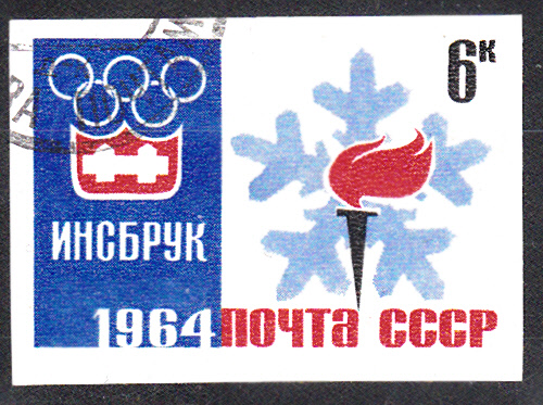Auf der Marke zu 6 Kopeken (MiNr 2868 B) sehen wir das Emblem der Olympischen Winterspiele 1964 und eine Fackel vor einem Schneekristall.
