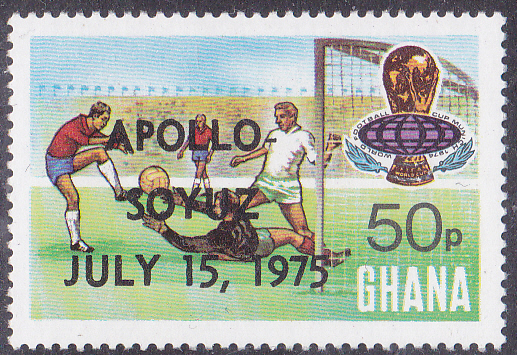 Zum Amerikanisch-sowjetisches Raumfahrtunternehmen Apollo-Sojus ist in Ghana die Serie zur Fußball-Weltmeisterschaft 1994 (MiNr 564-571) mit einem Buchdruck-Aufdruck "APOLLO- / SOYUZ / JULY 15, 1975" erschienen.