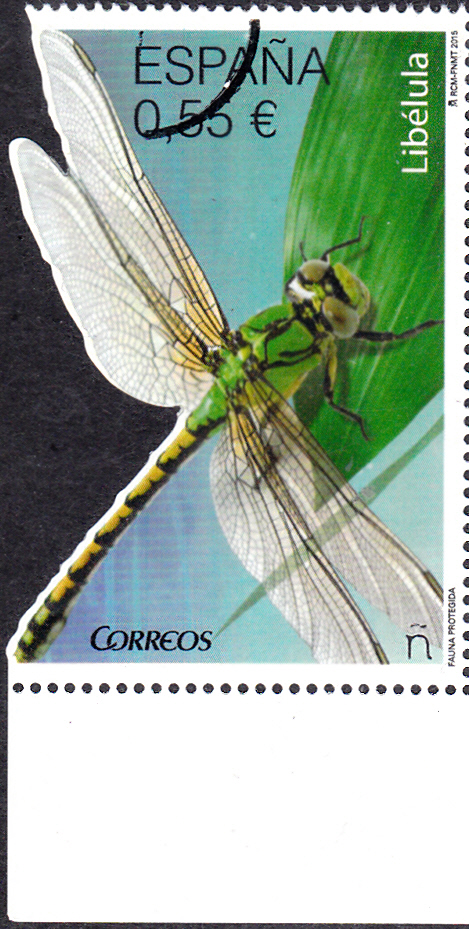 Aus einer Ausgabe "Geschützte Tierarten" aus Spanien kommt diese Marke (MiNr 4992) mit einer Libelle (Odonata). Die genaue Art ist mir leider nicht bekannt, auch im Michel wird nur der von mir genannte Namen angegeben. Die Marke ist linksseitig an den Konturen der Libelle geschnitten. Bei der gezeigten Marke handelt es sich um eine Mustermarke.