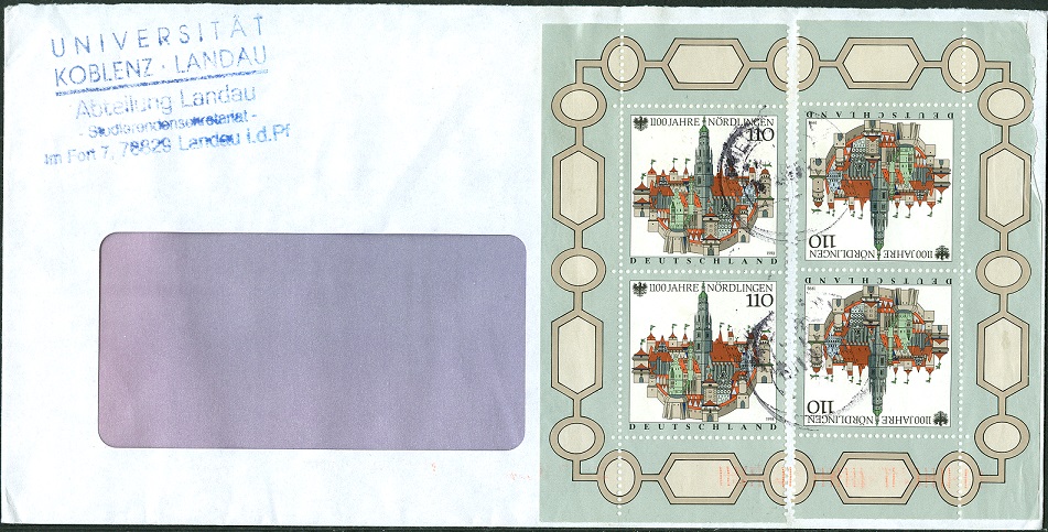 Auf diesem Brief wurden drei Ausschnitte der Ganzsachenpostkarte mit dem Wertstempel der MiNr 1851 Motiv Spreewald der Serie "Bilder aus Deutschland" zur Frankatur eines Briefes von 51 bis 500 g benutzt.