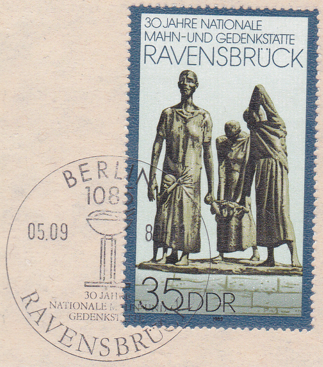 Zum Jubiläum "30 Jahre Nationale Mahn- und Gedenkstätte Ravensbrück" ist in der DDR diese Marke (MiNr 3274) mit der Bronzeplastik "Müttergruppe" in der Mahn- und Gedenkstätte Ravensbrück erschienen.