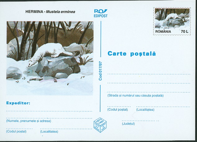 Sowohl der Wertstempel als auch die Illustration dieser rumänischen Ganzsache aus dem Jahr 1997 (P 1146) zeigen einen Hermelin.