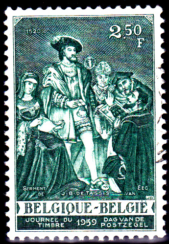 In Belgien erschien am 15.03.1959 diese Sondermarke Belgien MiNr. 1146 zum Tag der Briefmarke 1959 mit der Abbildung "Eid des Jean-Baptist von Taxis vor Karl V." nach einem Wandgemälde von J.-E. van den Bussche: