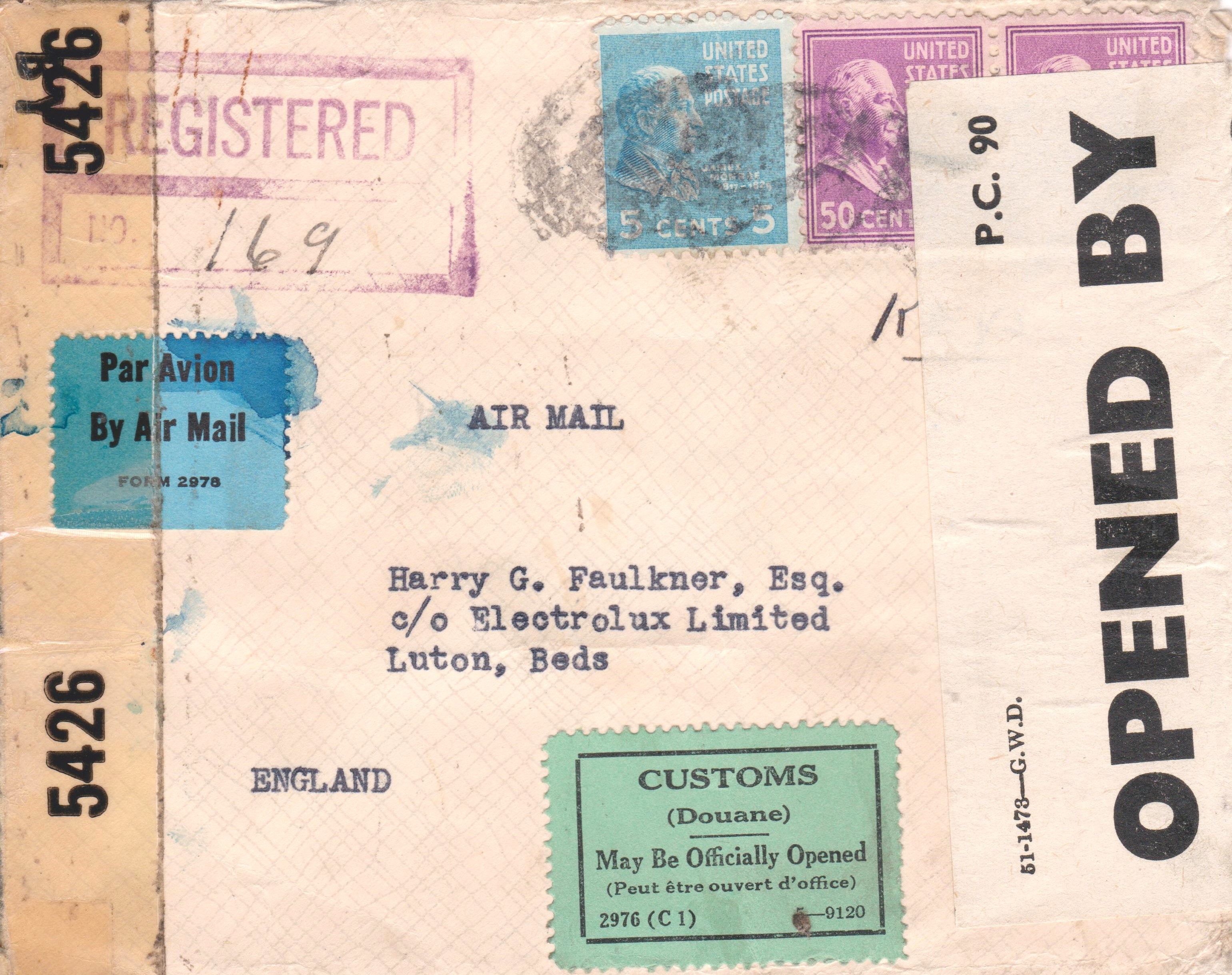 Luftpostbrief per Einschreiben aus den USA nach Großbritannien: