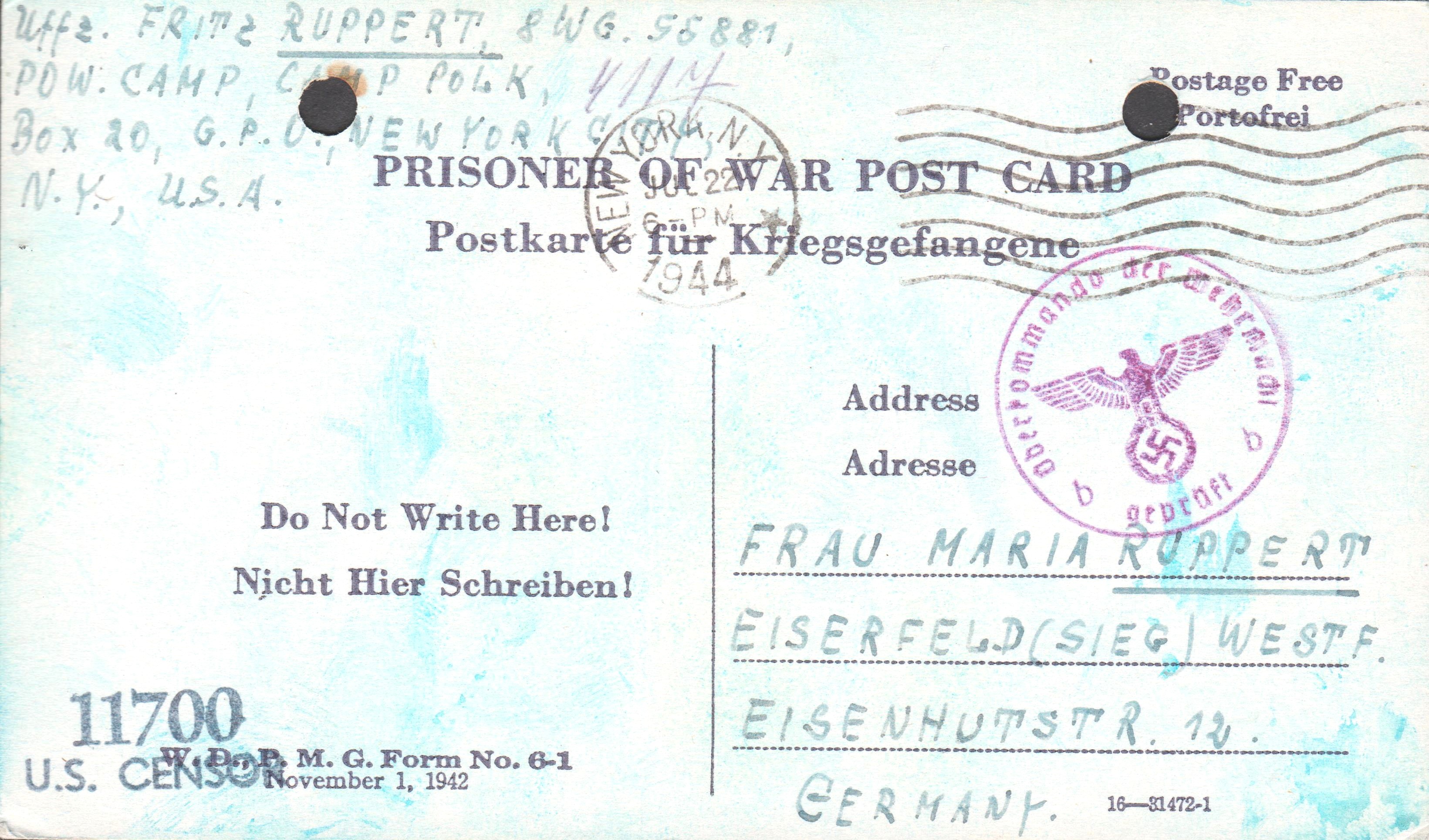 Vordruck "PRISONER OF WAR POST CARD", geschrieben von "Uffz. FRITZ RUPPERT" am 14.07.1944 im "POW CAMP, CAMP POLK", adressiert nach "EISERFELD(SIEG)":