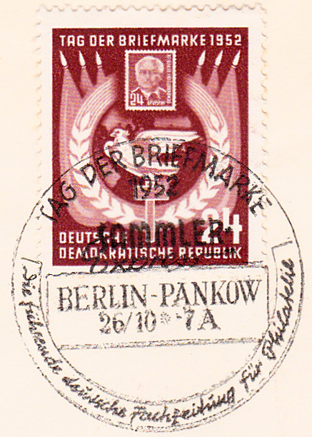 Einzelfrankatur der Marke zum Tag der Briefmarke 1952 auf einem Brief von Anklam nach Freiberg/Sachsen. Der Brief wurde mit einem Sonderstempel zur Lilienthal-Woche gestempelt.