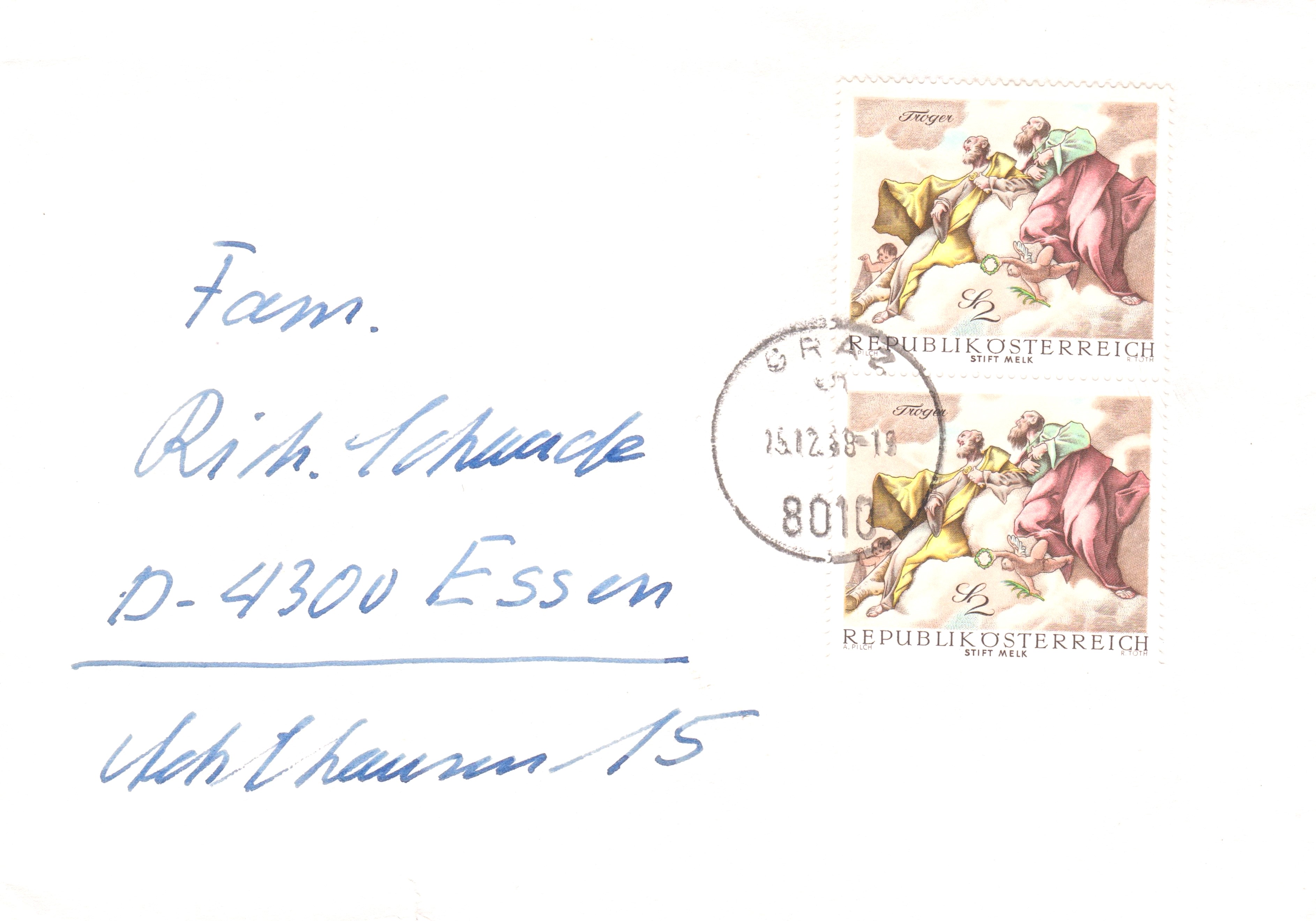 Österreich MiNr. 1280 zeigt ein Fresko von Paul Troger aus dem Festsaal des Gymnasiums in Melk: "Übergabe des Stiftes Melk an die Benediktiner", hier als Mehrfachfrankatur auf einem Brief nach Deutschland vom 15.12.1968: