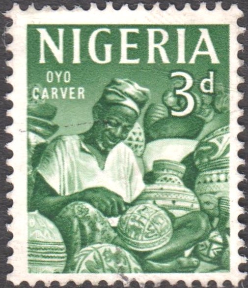 Diese am 01.01.1961 erschienene Freimarke, Nigeria MiNr. 96, zeigt als Motiv einen "OYO CARVER" = Kalebassenschnitzer: