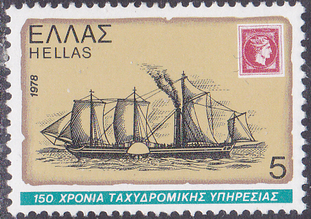 Zum Jubiläum "150 Jahre Griechische Post" ist in einer Serie in Griechenland diese Marke (MiNr 1309a) mit der Abbildung des Raddampfers "Maximilian" und der Marke MiNr 7 aus Griechenland.