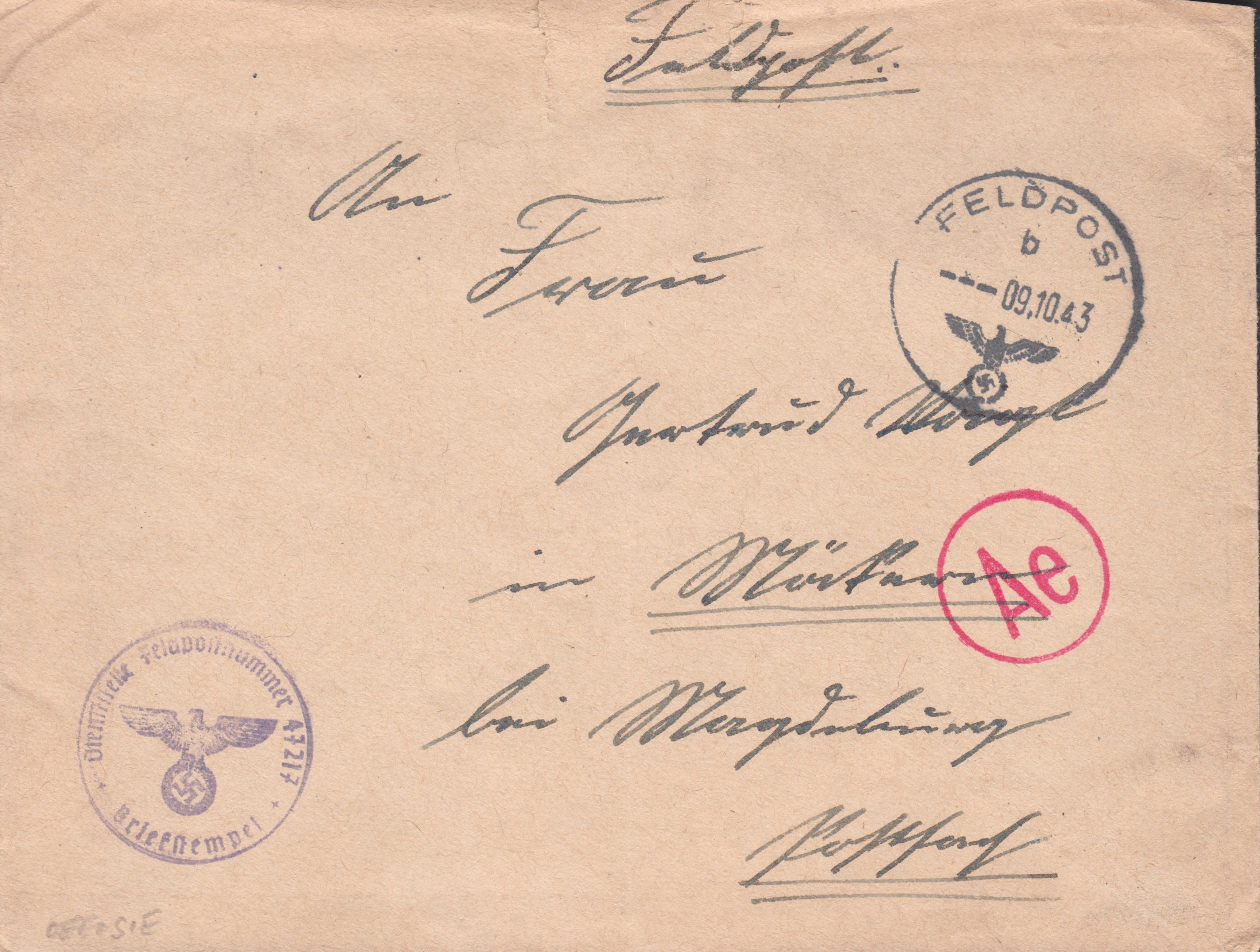 Dieser am 09.10.1943 aufgegebene Feldpostbrief zeigt einen Handstempel "Ae" = ABP München, Landsmann ED1.1, als Durchlaufstempel: