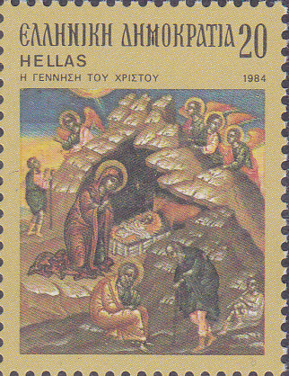 Die Weihnachtsmarken 1984 aus Griechenland zeigen Szenen aus der Allerheiligen-lkone (18. Jh.) von Athanasios Toundas. Auf der Marke zu 14Dr (MiNr 1571) sehen wir die Szene "Mariä Verkündigung".