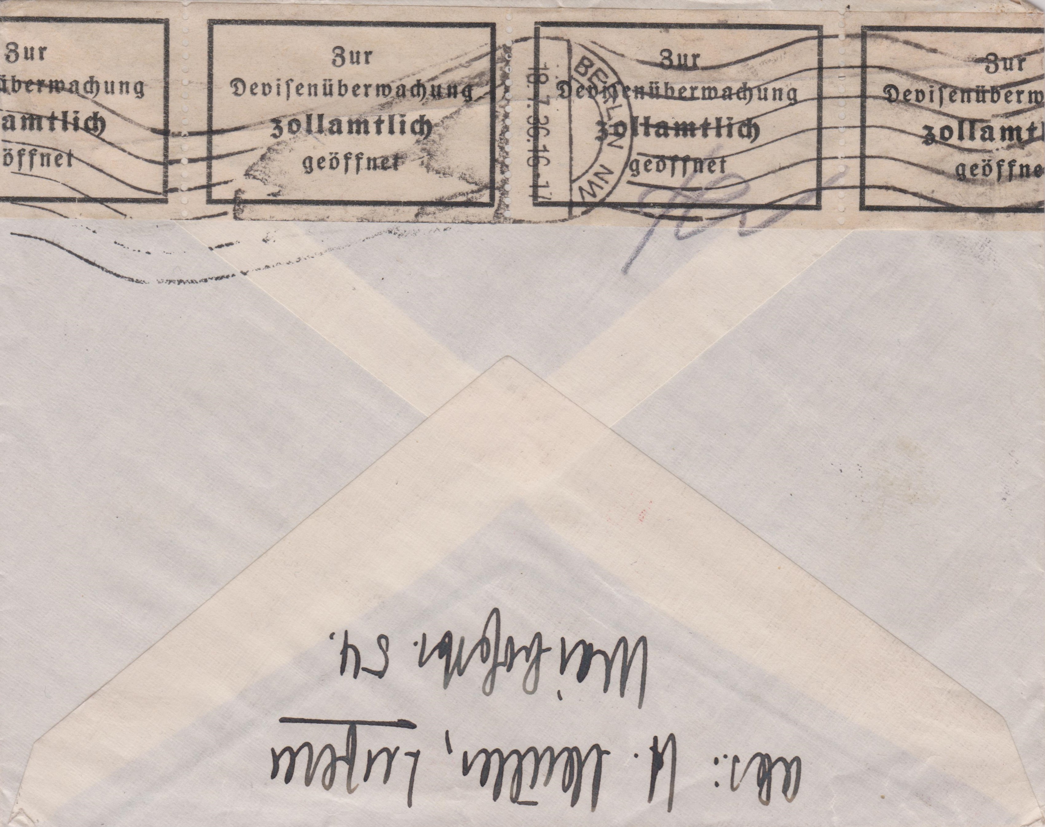Der Brief wurde in Berlin am 04.02.1937 rückseitig "Zur Devisenüberwachung zollamtlich geöffnet" und nach erfolgter Prüfung wieder verschlossen!