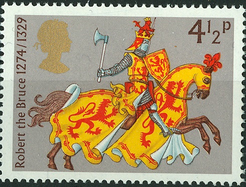 Robert the Bruce widmet die Postverwaltung des Vereinigten Königreichs eine farbenfrohe Marke zu 4 1/2 Pence. Seine Waffenwahl fiel, wenn nötig, anscheinend eher auf eine Axt.