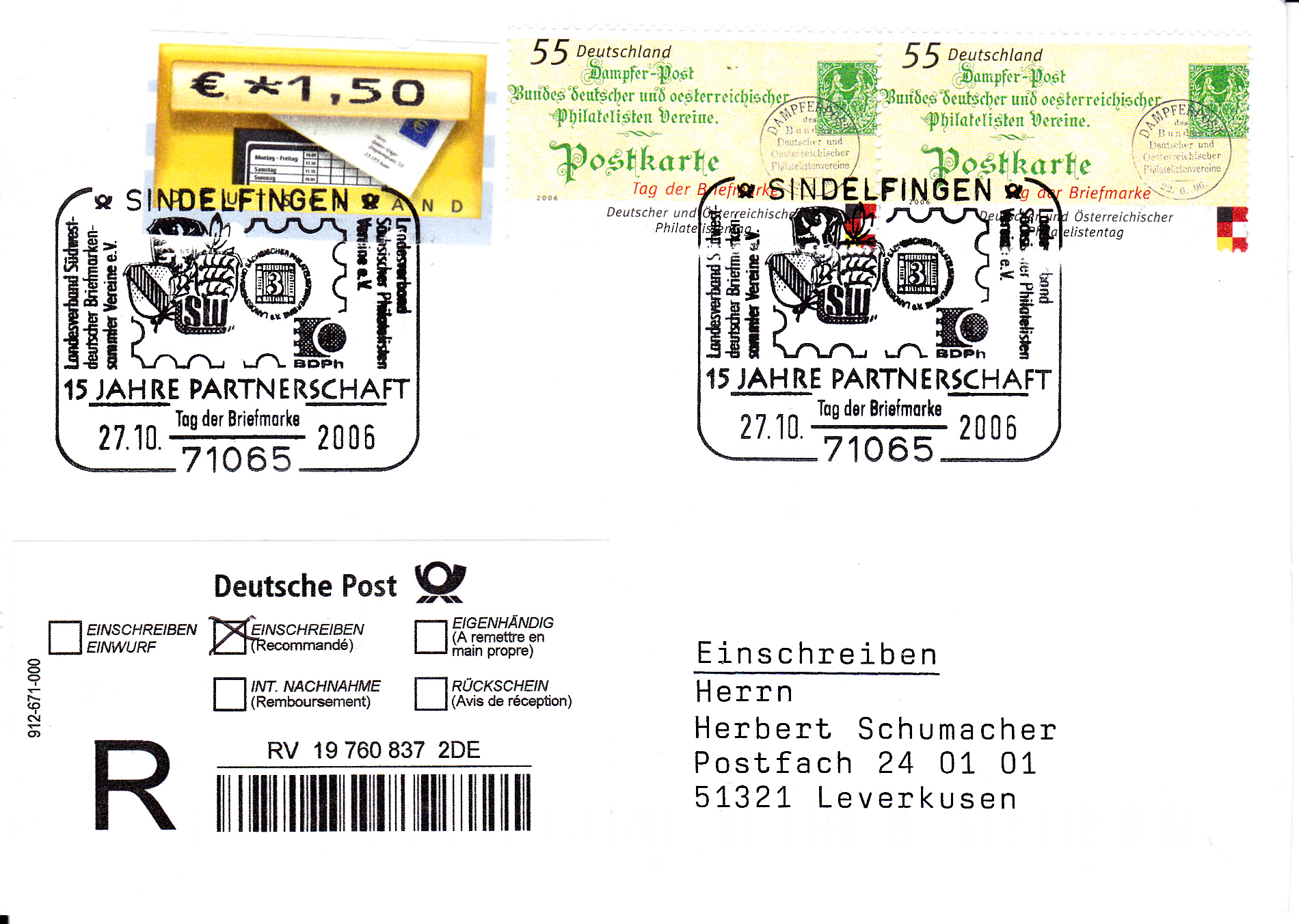 Per Einschreiben gelaufener Brief mit dem Sonderstempel vom 27.10.2006 aus Sindelfingen zum Tag der Briefmarke 2006 der Landesverbände Südwest und Sachsen.