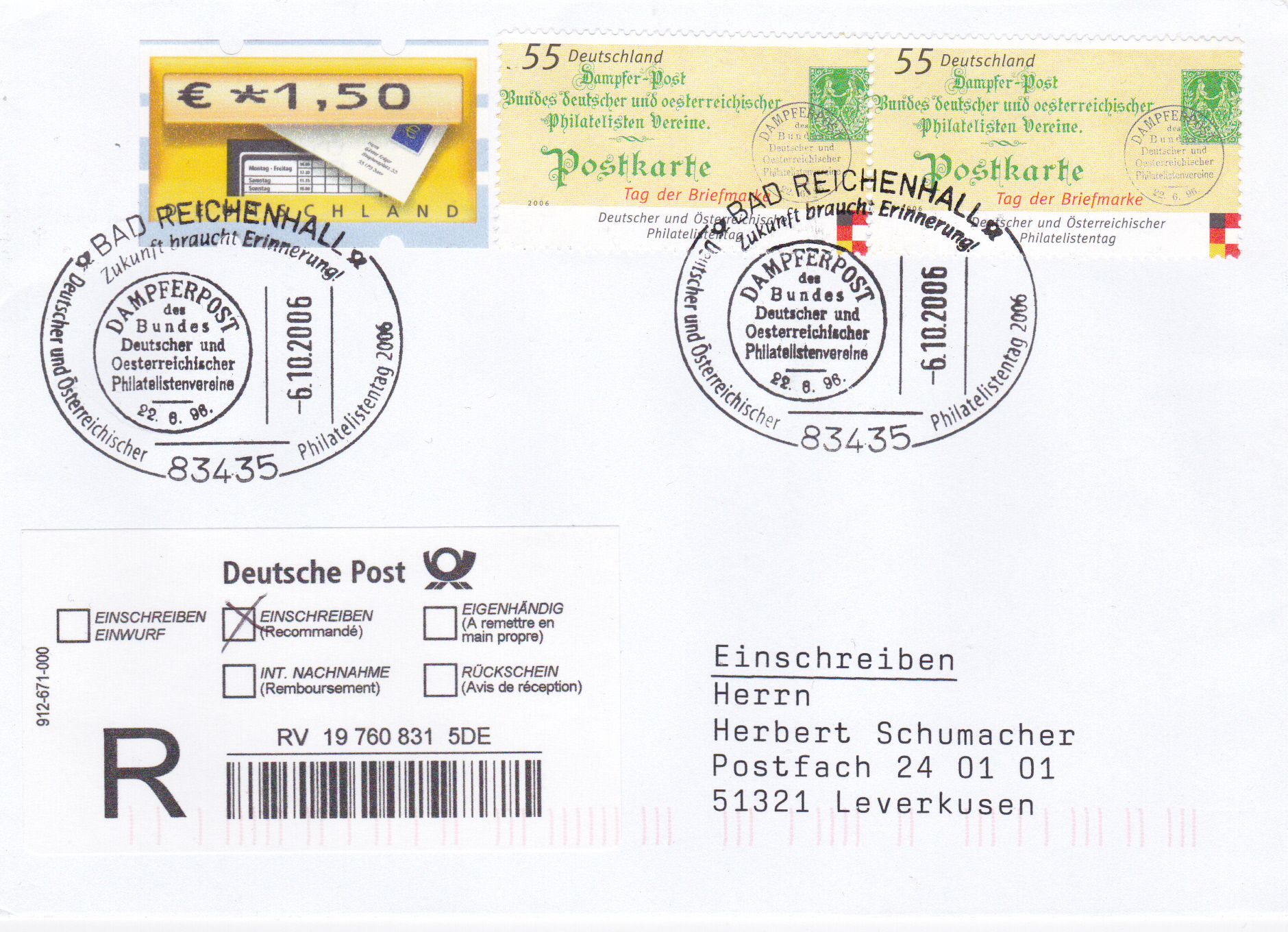 Einschreibe-Brief mit dem Sonderstempel vom 6.10.2006 aus Bad Reichenhall zum Philatelistentag 2006.