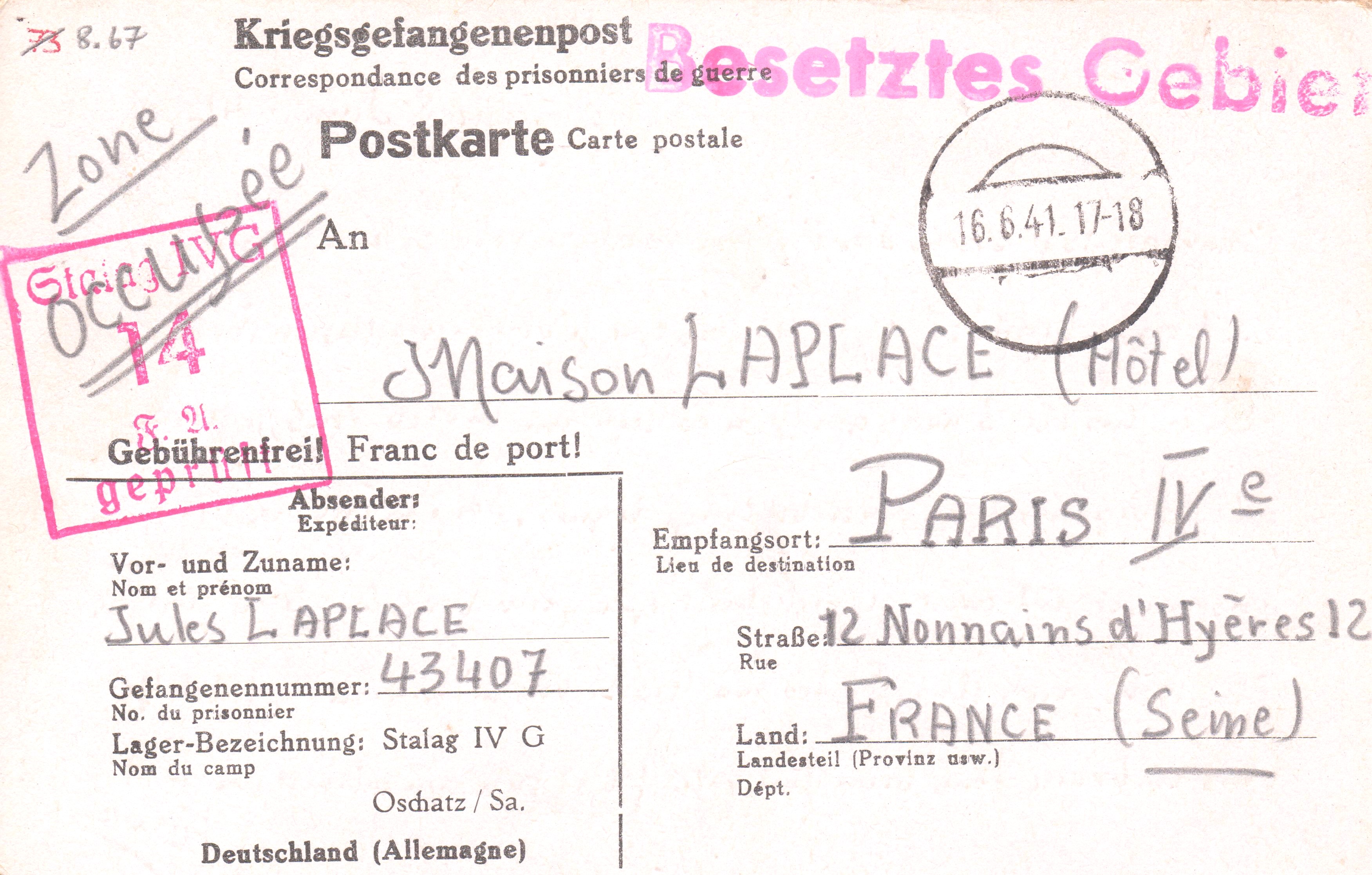 Postkartenvordruck Kriegsgefangenenpost mit eingedruckter Absenderadresse "Stalag IV G Oschatz / Sa.", geschrieben am 08.06.1941, Prüfstempel "Stalag IV G 14" in Rot, stummer Aufgabestempel vom 16.06.1941: