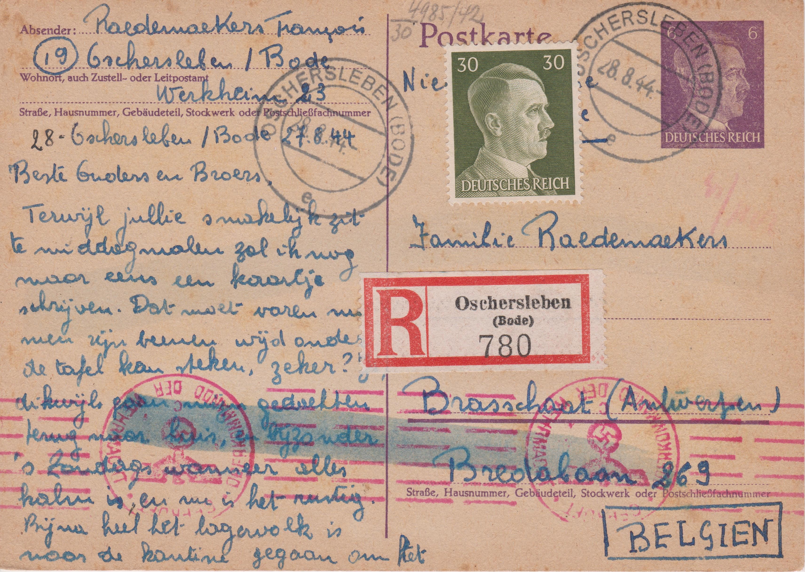 Die Postkarte wurde, wie zu dieser Zeit vorgeschrieben, am Postschalter in Oschersleben aufgegeben und an 28.08.1944 per Tagesstempel entwertet. Ein zweiter Tagesstempelabschlag wurde Blanko neben die Absenderangabe gesetzt, um die vorgeschriebene Kontrolle der Personalien des Einlieferers zu dokumentieren.