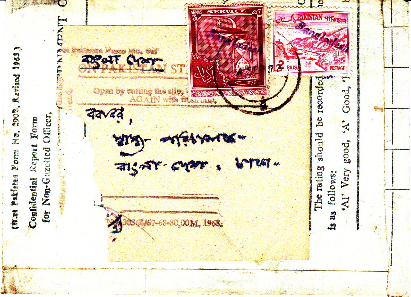 Der Versand erfolgte per Einschreiben mit Rückschein aufgegeben in Mohini Mills (Distrikt Kushtia), wie der einzeilige Postannahme-Stempel und die Beschädigung am oberen linken Rand zeigen (dort war der Rückschein angeklammert). Die Nummer des Einschreibebriefes ist unterhalb dieses Stempels handschriftlich (R 829) angebracht worden, ebenso das Einlieferdatum ( 22 / XI, also 22.11. 1972). Die Gebühr für den Zusatz Einschreiben mit Rückschein (80 Paisa) wurde auf der Rückseite des Briefes verklebt. Benutzt wurden Pakistanmarken mit Aufdruck "Bangladesh"