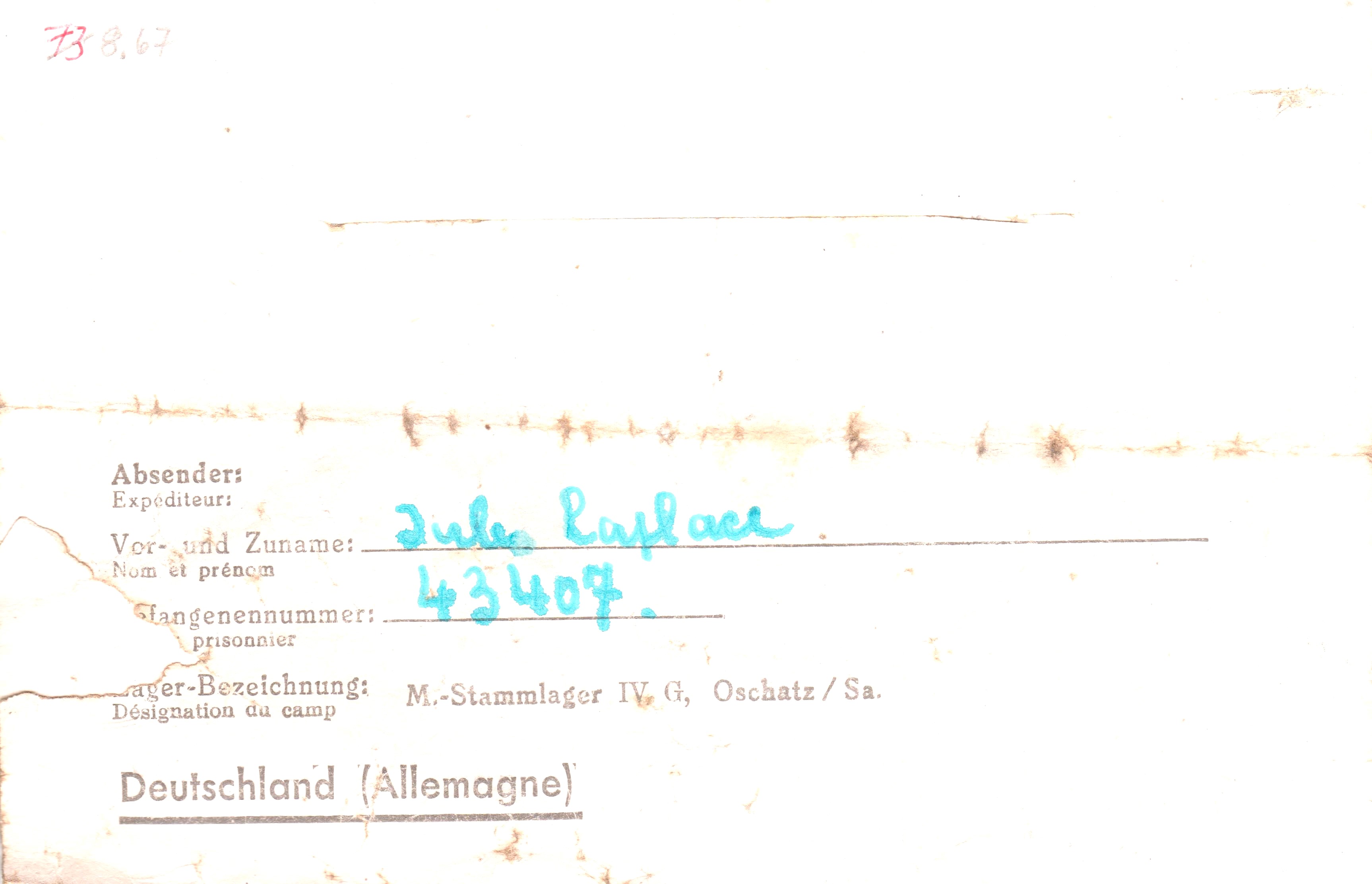 Briefvordruck Kriegsgefangenenpost mit eingedruckter Absenderadresse "M.-Stammlager IV G, Oschatz / Sa.", geschrieben am 22.11.1942, Prüfstempel "Stalag IV G 18", stummer Aufgabestempel vom 30.11.1942: