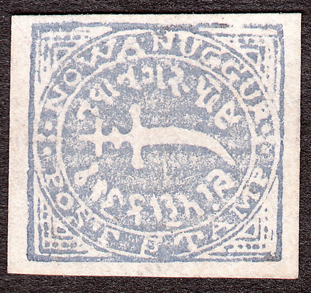 1877 erschien diese als MiNr. 1 katalogisierte Freimarke zu 1 Dokra auf gestreiftem Papier mit der Darstellung eines Schwertes auf waagerecht gestreiftem Papier: