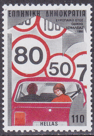 Zum Europäischen Jahr der Verkehrssicherheit erschien 1986 in Griechenland diese Marke (MiNr 1627) mit einem Sicherheitsgurt und einem Lenkrad.
