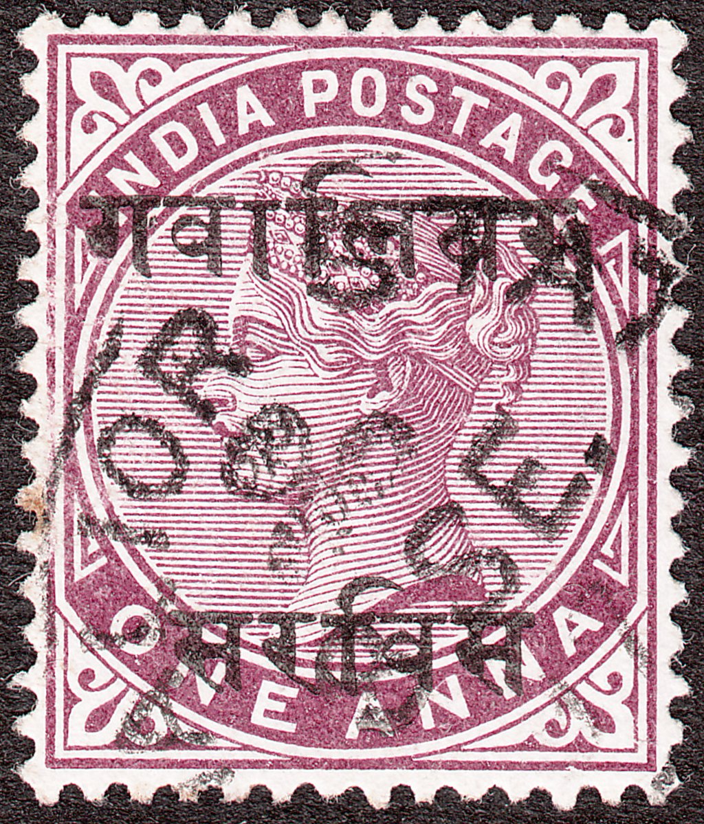 Gwalior versah 1895 die Freimarke Indien MiNr. 33 mit einem zweizeiligen schwarzen Aufdruck in Devanagari-Schrift, oben steht Gwalior, unten Sarvis = Dienst: