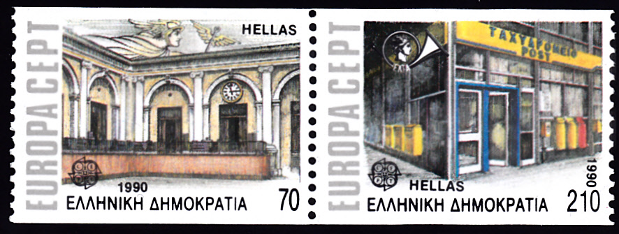 Die Europamarken 1990 sind in Griechenland zum Gemeinschaftsthema "Postalische Einrichtungen" am 11. Mai 1990 erschienen. Die Marke gibt es in zwei Zähnungen: A = vierseitig gez. K 13 3/4:12 1/4 und C = senkrecht gez. 12 1/4. Hier eine Marke zu 210 Drachmen aus dem Heftchen (MiNr 1743 C) mit der Abbildung eines Modernen Postamtes in Athen. Die Auflage dieser Marke betrug 200 000 Stück.