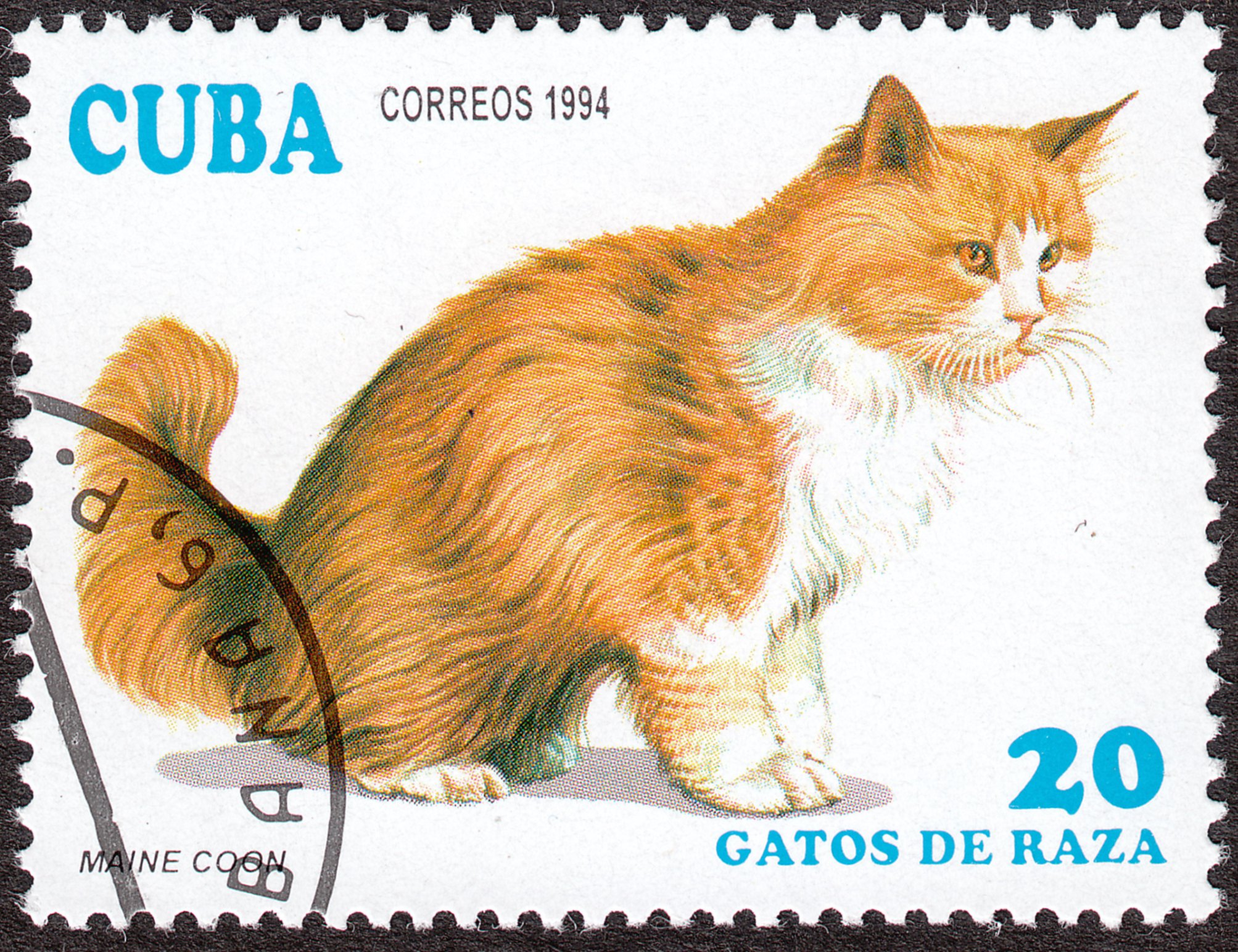 Hier eine Marke aus Kuba mit der Darstellung einer Maine-Coon-Katze: