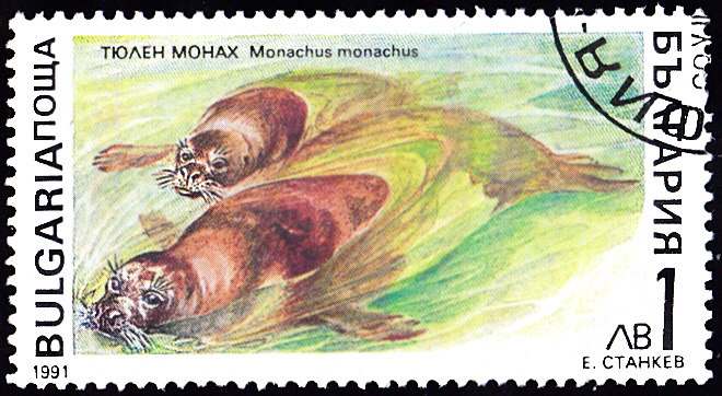 Auch auf einer Marke aus Bulgarien (MiNr 3963) sehen eine Abbildung mit Mittelmeer-Mönchsrobben (Monachus monachus).