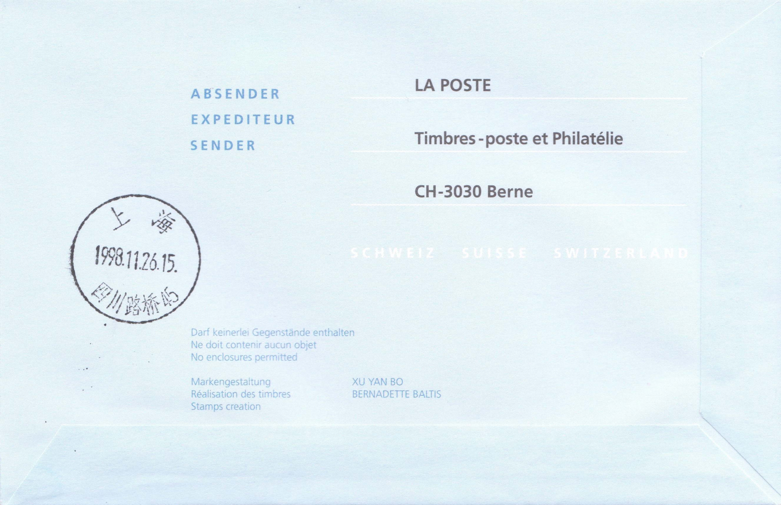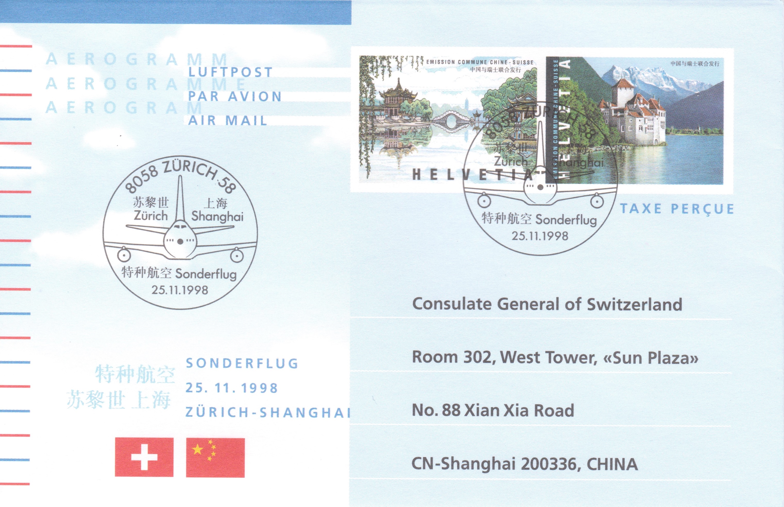 Diese Belege dokumentieren den Erstflug einer Swissair Boeing 747-357 von Zürich nach Shanghai am 25.11.1998 mit Ankunftsstempel "14":
